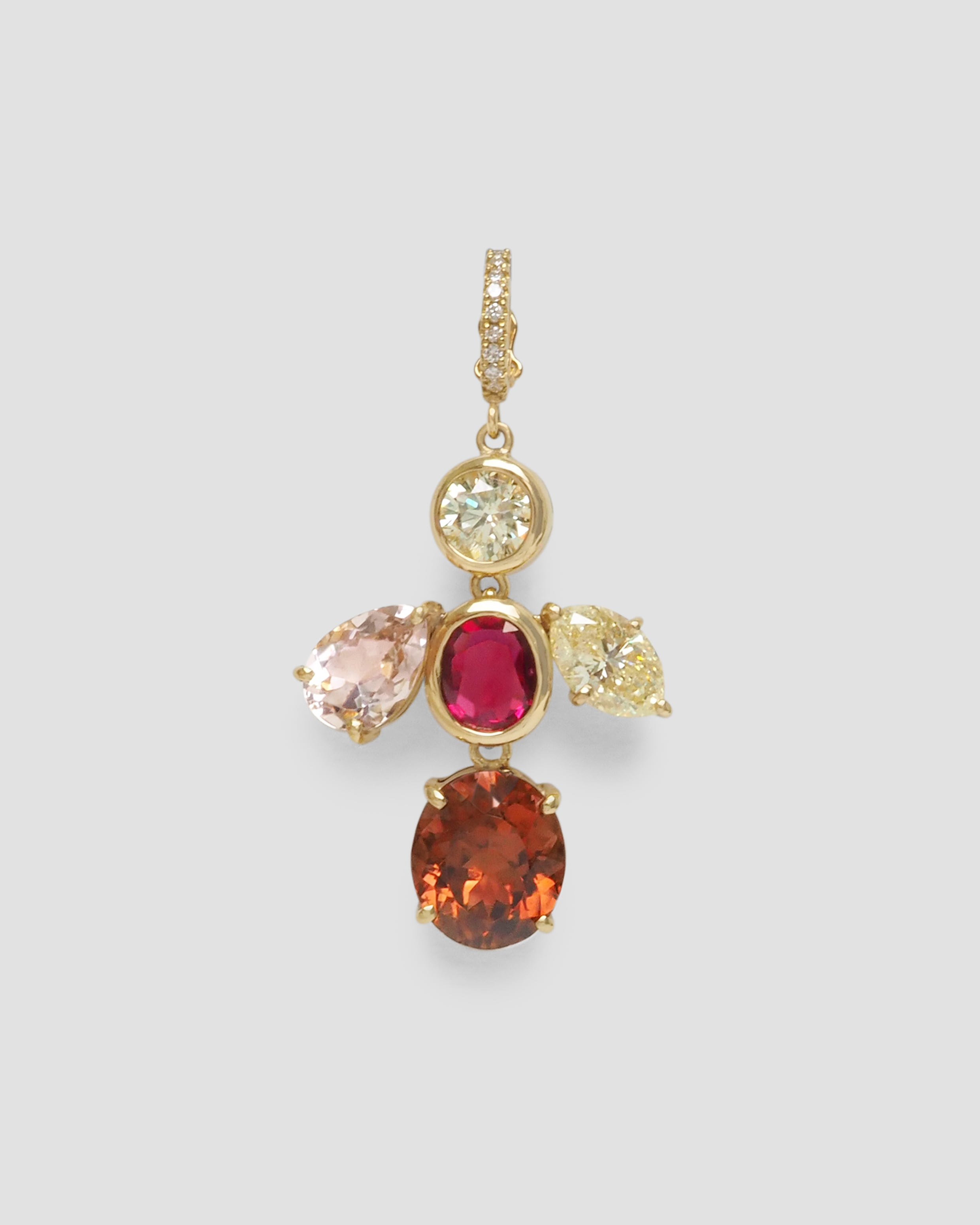 品番:14599 素材:K18YG ルース: ダイヤ 1.16ct/0.735ct/0.05ct ルビー 0.88ct モルガナイト 1.38ct トルマリン3.89ct" 寸法:約40.0x24.0mm 重さ:8.5g"